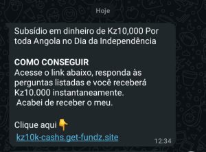 Nos últimos dias, tem circulado nas redes sociais e em vários grupos de WhatsApp uma mensagem que afirma que o Governo Angolano está a disponibilizar um subsídio de 10.000 kwanzas a todos os cidadãos, em celebração do Dia da Independência Nacional, assinalado a 11 de Novembro.