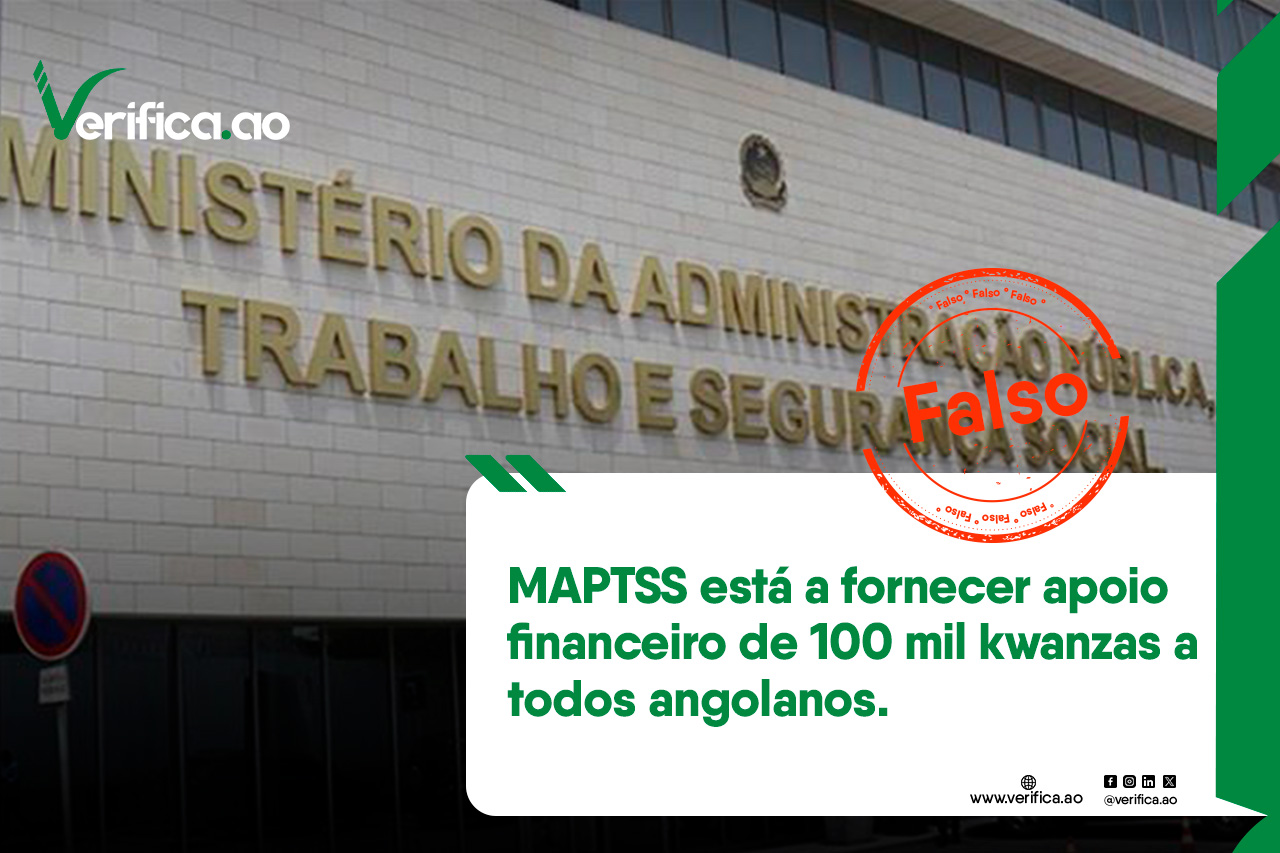 Falso – A mensagem que circula sobre um apoio financeiro universal de 100.000 kwanzas, alegadamente promovido pelo MAPTSS, não corresponde à verdade. Não existe tal programa. A informação foi desmentida oficialmente pelo próprio ministério.